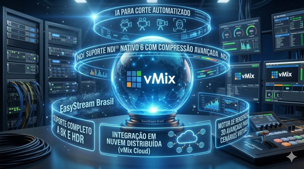 🧠 1. A Automação Semântica (IA de Corte): Preve-se que nas próximas gerações o vMix deixará de ser uma ferramenta de reação para ser um motor de predição. Através de metadados das câmeras e análise de áudio em tempo real, a IA poderá realizar pré-cortes estéticos e automação de enquadramentos baseados na emoção do apresentador, permitindo que um único operador gerencie produções de complexidade cinematográfica.